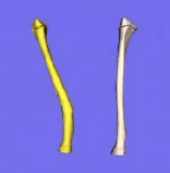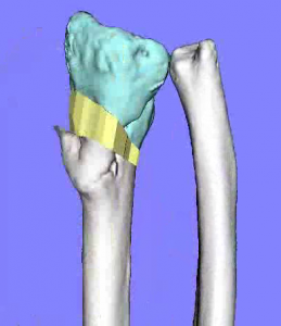 対象となる手足の変形した骨のCTデータをもとに、正確な3次元モデルをコンピューター上で作成して、反対側の健康な骨や正常な骨のデータを目標に3次元的にぴたりと矯正シミュレーションするのです。矯正シミュレーションには、独自に開発したコンピュータープログラムを用います。3次元的な変形軸を計算して理想的な矯正手術を提案する、全く新しい技術です。さらに、シミュレーション通りの手術を実際に行うために、予定の部位で骨を切り、正確に矯正するためのカスタムメイド手術部材を作成して手術に利用する試みを始めています。